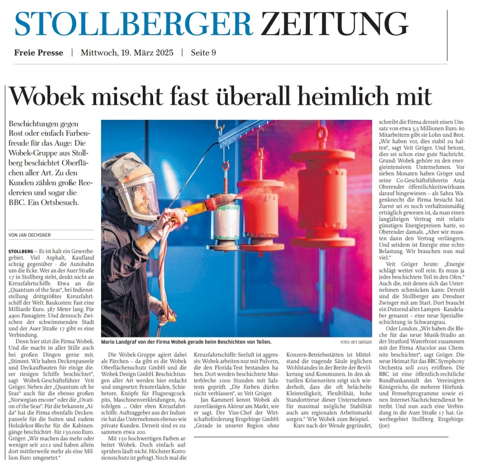 Hier geht es zum vollständigen Zeitungsbereicht der Freien Presse und zur Erklärung, was die WOBEK-Gruppe mit Kreutzfahrtschiffen und dem BBC zu tun hat. Vieles nämlich! Oberflächenbeschichtungen und Korrosionsschutz werden überall gebraucht, vor allem in Gebieten, wo Materialien dem Wetter ständig ausgesetzt sind.